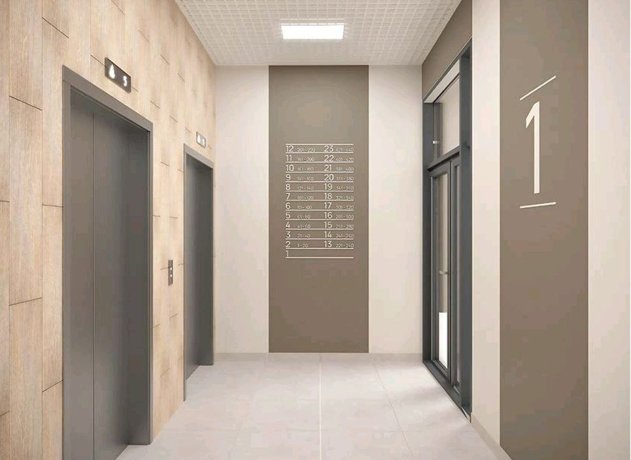 Отделка лобби выполнена в современном стиле, используется керамогранит, имитирующий